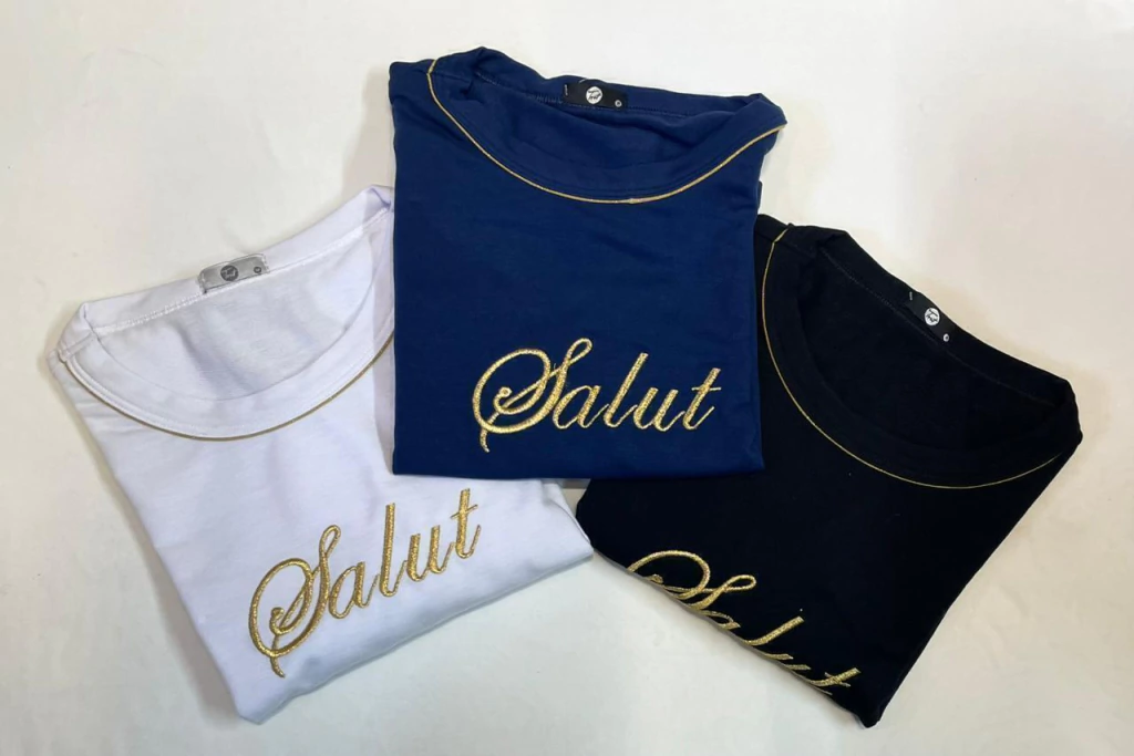Blusa cropped bordada com a palavra Salut, confeccionada em moletinho leve e macio. Possui decote redondo e acabamento com vivo dourado delicado na gola, que adiciona um toque sutil de elegância. Disponível nas cores branco, preto e azul-marinho, é uma peça charmosa e versátil, perfeita para compor looks casuais com estilo e conforto.