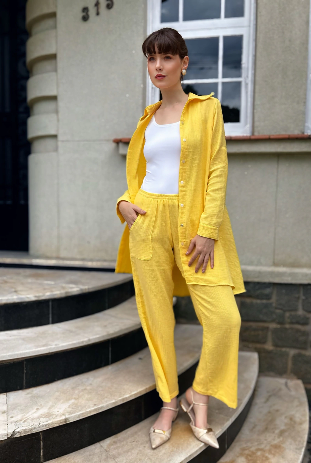 Confeccionada em tecido 100% algodão, a calça pantalona Beatrice é a escolha certa para quem busca conforto e versatilidade. Possui bolsos grandes e elástico na cintura, além de uma modelagem que garante liberdade de movimento. Por ser de algodão, é hipoalergênica, ideal para peles mais sensíveis ou propensas a alergias, e também é respirável, proporcionando frescor e conforto térmico. Disponível em um tom de amarelo suave, que traz delicadeza e charme à peça. Para manter sua peça sempre impecável, basta seguir as instruções de cuidado presentes na etiqueta.